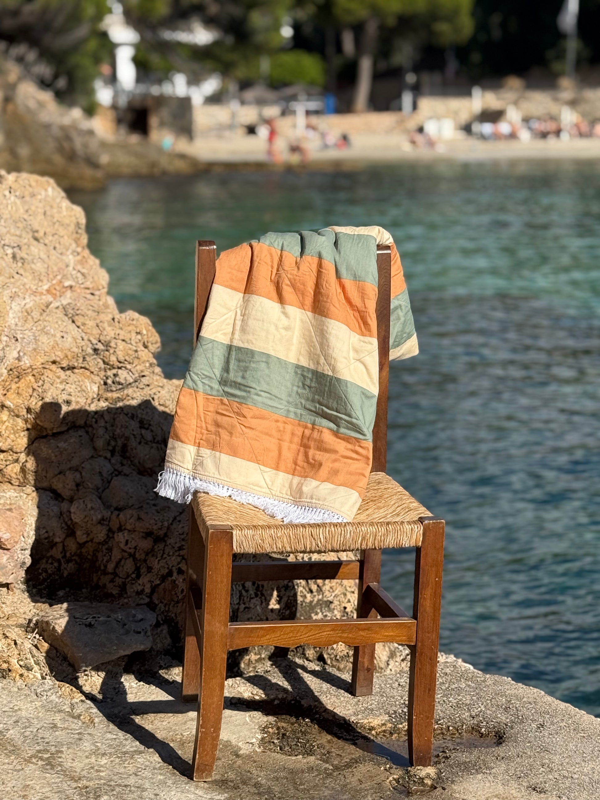 The signature GOLDNBROWN piece, the Forest Stripe GnB Towel balances form, function, and style with ease. A generous 1.7m x 1m, it is finished with cotton fringing and a crisp drill edge. One side carries our exclusive hand-blocked batik, the reverse a soft quick-dry towelling — joined with a secure diagonal smocking stitch that ensures strength, durability, and no shrinkage. Washed over and over, it softens beautifully with time, its craftsmanship evident in every detail. Crafted for every setting — by the beach, by the pool, in the bathroom, or simply hung at home.