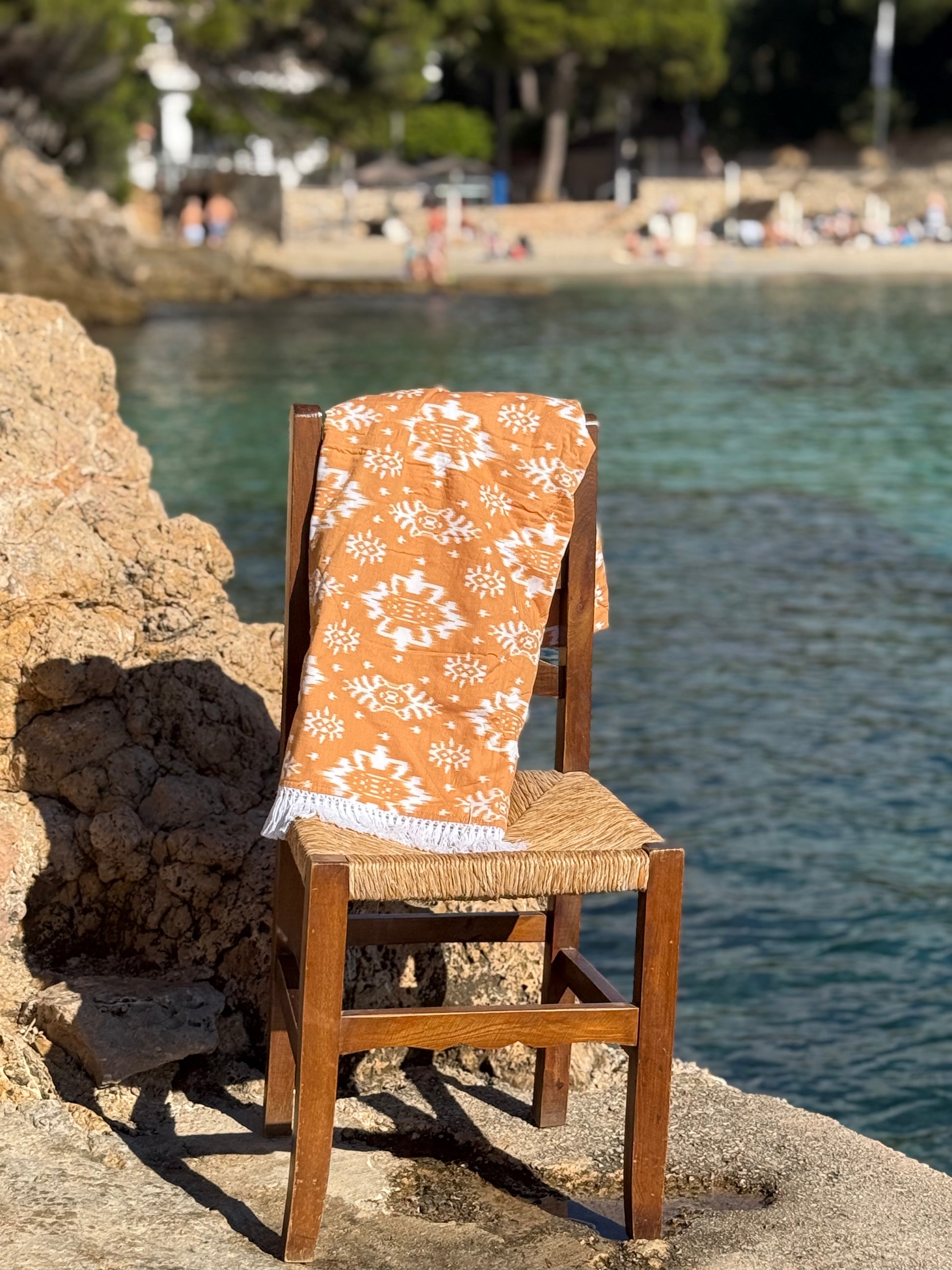 The signature GOLDNBROWN piece - the Tan Maggie GnB Towel balances form, function, and style with ease. A generous 1.7m x 1m, it is finished with cotton fringing and a crisp drill edge. One side carries our exclusive hand-blocked batik, the reverse a soft quick-dry towelling — joined with a secure diagonal smocking stitch that ensures strength, durability, and no shrinkage. Washed over and over, it softens beautifully with time, its craftsmanship evident in every detail. Crafted for every setting — by the beach, by the pool, in the bathroom, or simply hung at home.