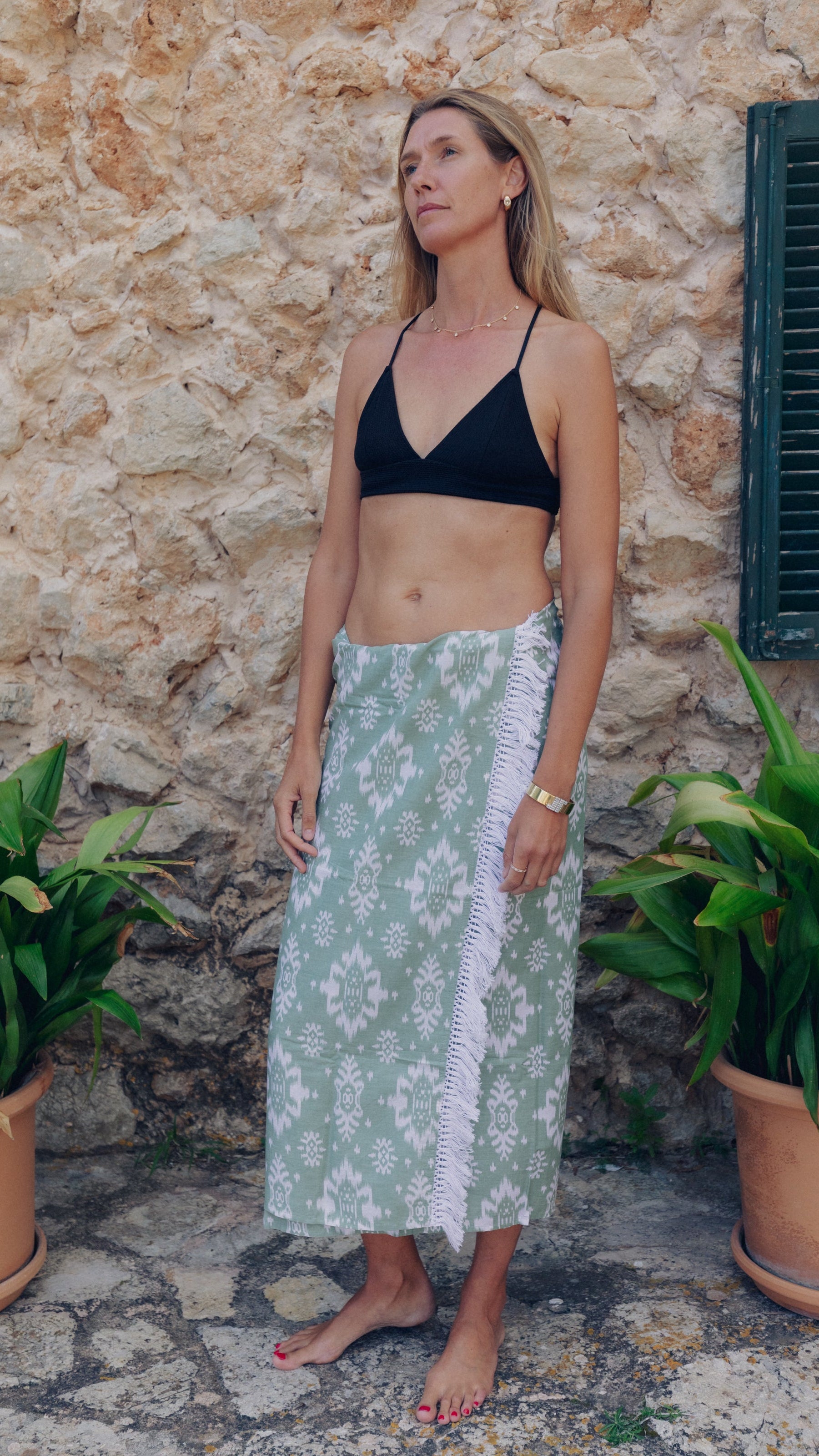 The Dusty Sage Green Sassle is GOLDNBROWN’s take on the classic sarong — cut from 100% cotton hand-printed batik and finished in a generous 1.6m x 1m proportion with crisp white fringing.